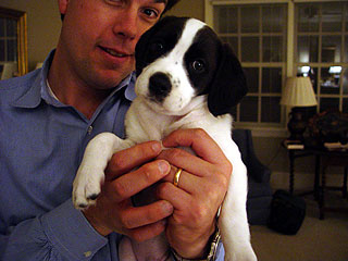 MILLIE Millie lives with my cousin Anna Averitt and her husband Murphy. Millie is a mix of cocker spaniel and springer spaniel. She was born in late 2002, and in the picture shown here is only about six weeks old. (Obviously, she was not old enough to understand "sit" yet, so Murphy is holding here in this picture.) Even at this young age, though, Millie was chasing around dogs who were much older, and larger, than her. |